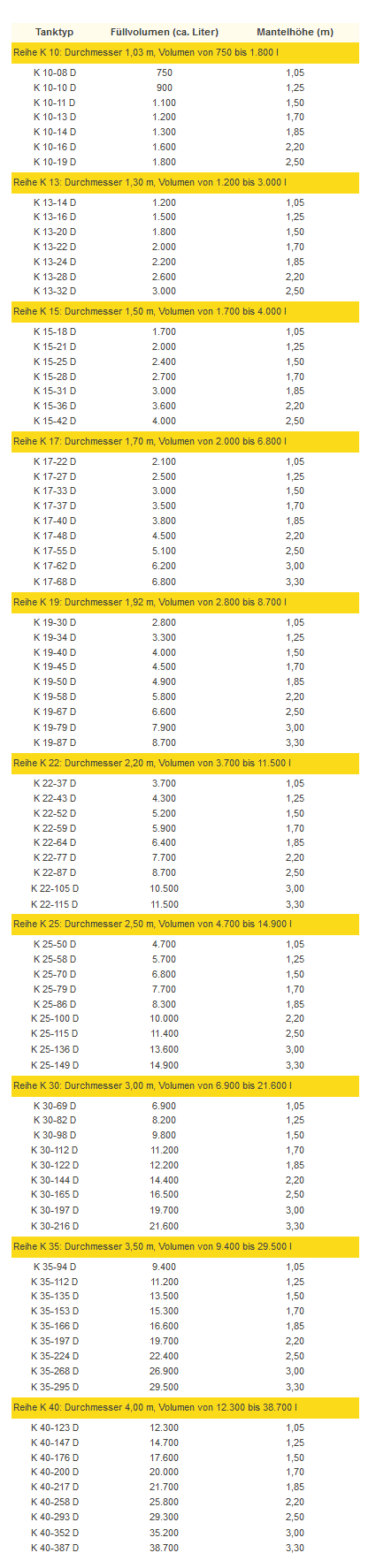 Kellertanks von Haase - mit Durchmessern von 1 m bis 4 m und Höhen von 1 m bis 3,30 (Standardtypen)